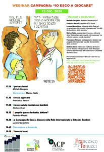 Lo scorso 12 Dicembre è stato realizzato, in collaborazione con l’Associazione Culturale Pediatri (ACP), il secondo webinar di Dialogo con i pediatri, per continuare la promozione della Campagna “Io esco a giocare”,
